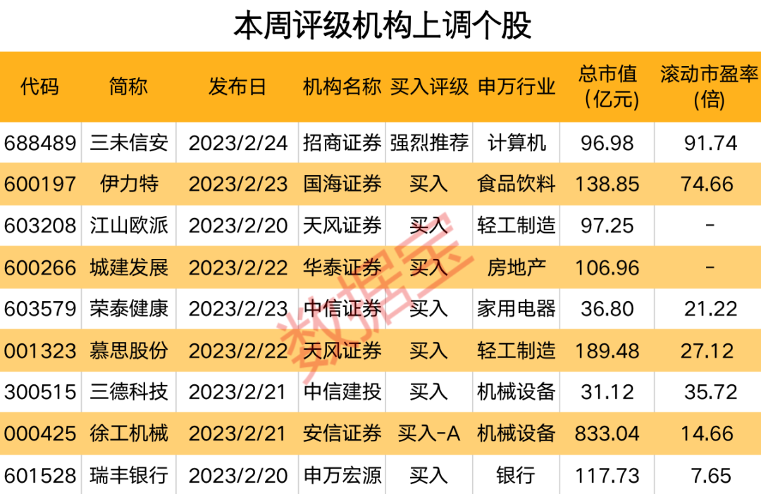2月20日至24日,机构合计上调9股评级。招商证券上调三未信安至“强烈推荐”;安信证券上调徐工机械至“买入-A”;国海证券上调伊力特至“买入”。