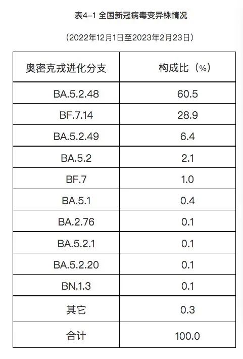 12月以来本土病例病毒变异株监测情况。2022年12月1日至2023年2月23日,全国共报送18618例本土病例新冠病毒基因组有效序列,全部为奥密克戎变异株,共存在36个进化分支。主要流行株为BA.5.2.48(60.5%)和BF.7.14(28.9%)(表4-1)。共发现本土重点关注变异株22例,其中,1例XBB.1,5例XBB.1.5,4例BQ.1,5例BQ.1.1,1例BQ.1.1.17,4例BQ.1.2和2例BQ.1.8。