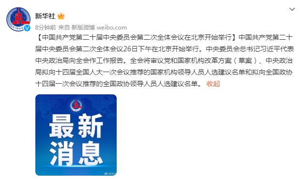 中国共产党第二十届中央委员会第二次全体会议26日下午在北京开始举行。中央委员会总书记习近平代表中央政治局向全会作工作报告。全会将审议党和国家机构改革方案(草案)、中央政治局拟向十四届全国人大一次会议推荐的国家机构领导人员人选建议名单和拟向全国政协十四届一次会议推荐的全国政协领导人员人选建议名单。