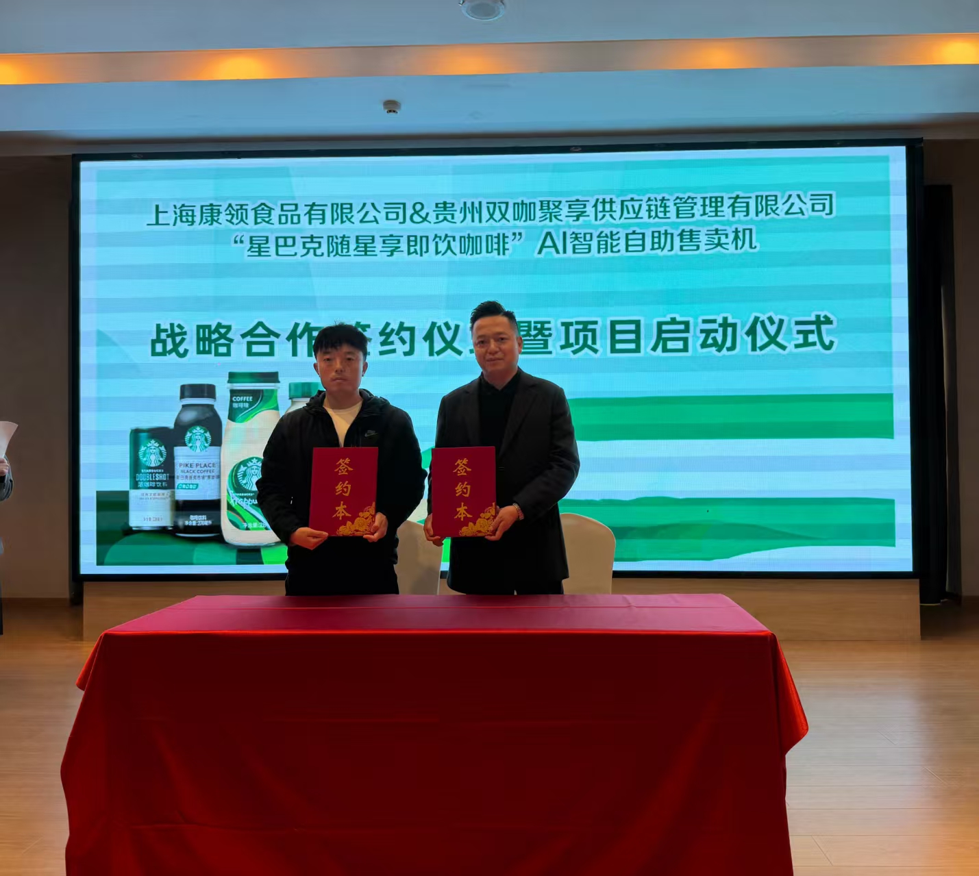 2025年11月8日,上海康领食品有限公司与贵州双咖聚享供应链管理有限公司“星巴克随星享即饮咖啡”AI智能自助售卖机战略合作签约仪式暨全国联营商计划启动会,在贵阳盛大举行。上海康领食品签约代表欧总、贵州双咖聚享签约代表李总共同签署协议,标志着星巴克即饮咖啡智能零售项目正式落地西南,并同步启动全国市场拓展布局。