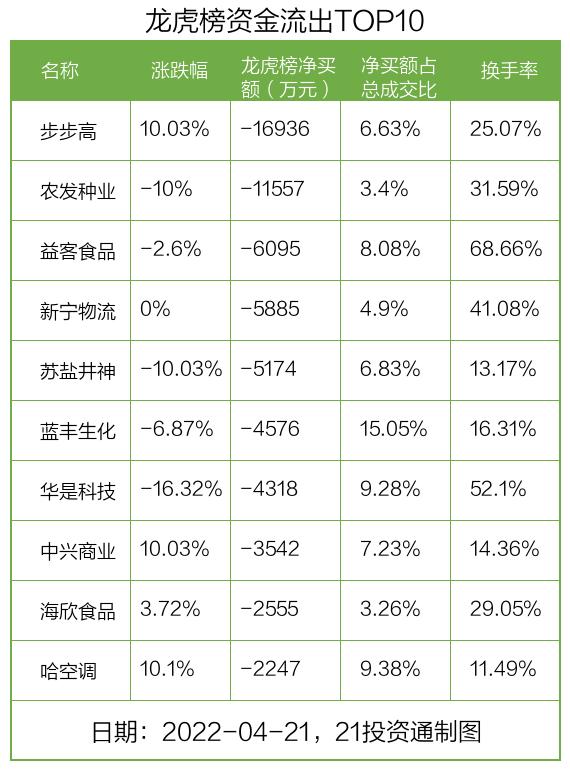 而龙虎榜中资金净流出最多的是步步高(002251.SZ),被净卖出为1.69亿元,占总成交金额的6.63%。步步高收盘上涨10.03%,换手率为25.07%。