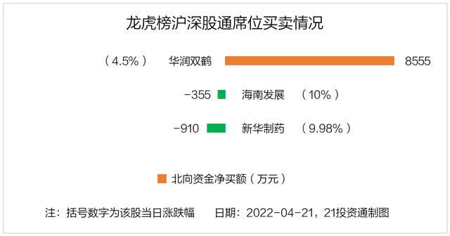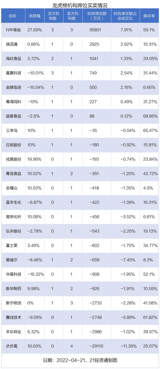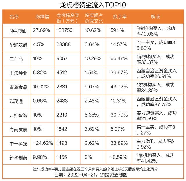 本文摘要:4月21日,上证指数下跌2.26%,深证成指下跌2.7%,创业板指下跌2.17%。盘后龙虎榜数据显示,共有46只个股因当日异动登上龙虎榜,资金净流入最多的是N中海油(600938.SH),达12.87亿元。据21投资通(微信号ID:touz… …
