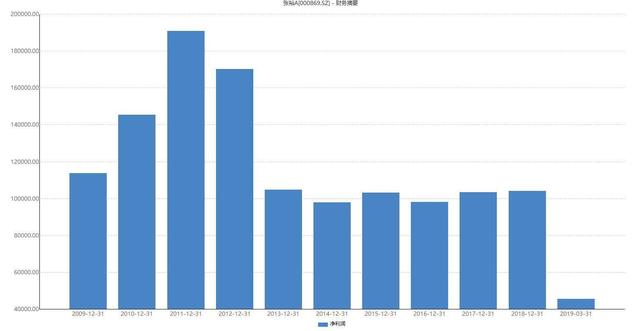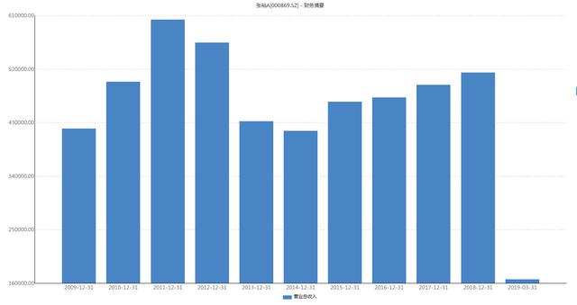 Wind数据显示,2012年至2018年,张裕逐年营收分别为56.4亿元、43.2亿元、41.6亿元、46.5亿元、47.2亿元、49.3亿元、51.4亿元;净利润分别为17亿元、10.5亿元、9.8亿元、10.3亿元、9.8亿元、10.3亿元、10.4亿元。