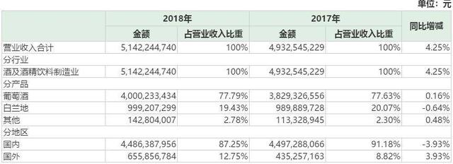 作为国产白兰地的生产龙头,张裕数据看起来很美:2013年到2017年,张裕白兰地连续5年占据国产白兰地96%以上的市场份额。然,这只是占国产白兰地的比重!还有,2018年财报显示,张裕白兰地营收仅为9.99亿元,仅同比增长0.94%。张裕白兰地增收不增利的数据,显示其转型尚未取得显著成效。