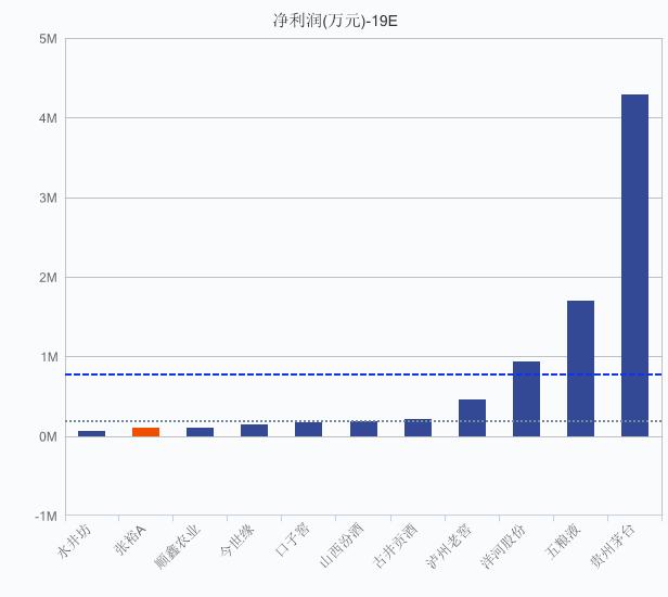 据Wind数据显示,在2019年净利润预测中,张裕以10.65亿元排在白酒与葡萄酒分类中倒数第二位,仅高于水井坊的7.5亿元,且远低于该行业分类的中位数与平均值。