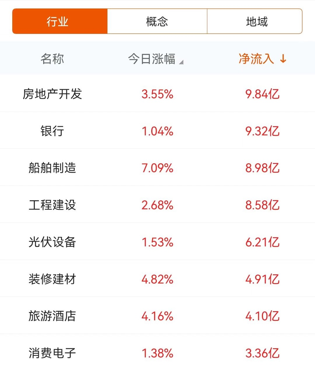 今日房地产、银行等板块主力净流入靠前,其中房地产净流入9.84亿元。
