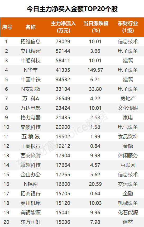 东方财富Choice数据显示,6月27日主力净买入前20大个股中,拓维信息排名第一,主力净买入7.30亿元,该股今日涨停;立讯精密排名第二,主力净买入5.91亿元。