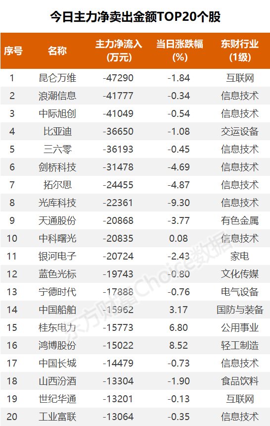 东方财富Choice数据显示,6月27日主力净卖出前20大个股中,昆仑万维排名第一,主力净卖出4.73亿元;浪潮信息排名第二,主力净卖出4.18亿元。