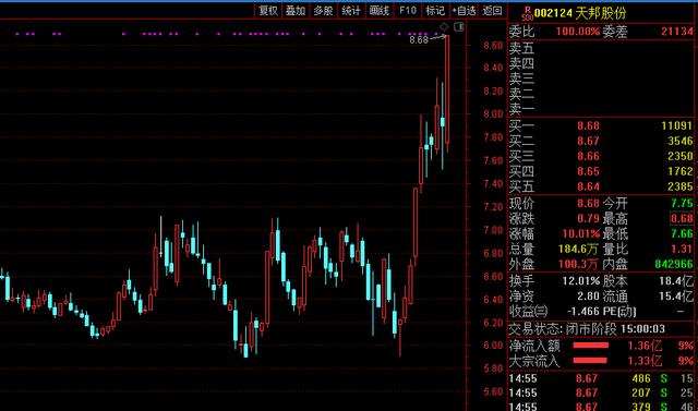 3月29日,天邦股份低开高走,尾盘封死涨停。截至收盘报8.68元,创出近10个月新高。全天成交金额15.4亿元,换手率12%。