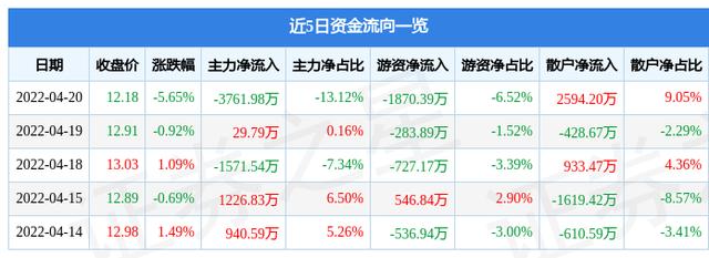 资金流向数据方面,上个交易日主力资金净流出3761.98万元,游资资金净流出1870.39万元,散户资金净流入2594.2万元。近5日资金流向一览见下表: