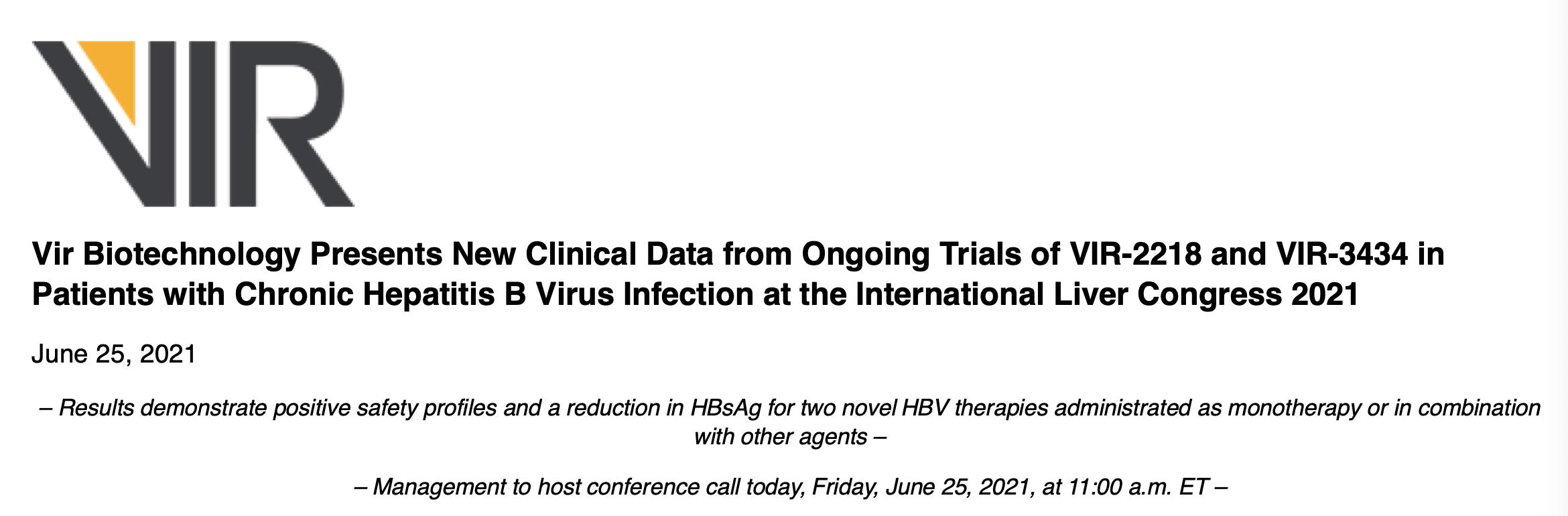宣布了正在进行的VIR-2218 2期临床试验和正在进行的VIR-3434 1期研究的新数据。在本届欧肝会(EASL2021)上,这些结果证明了积极的安全性以及发现两种化合物降低乙肝表面抗原作用。
