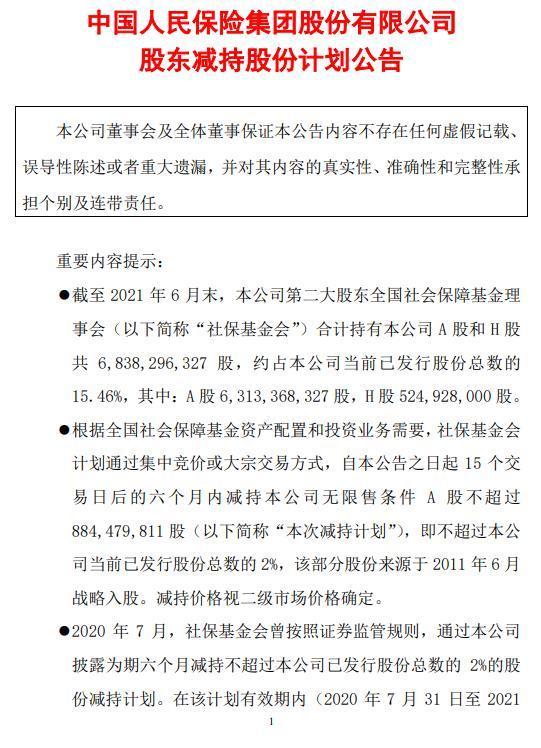 需要提及的是,去年7月9日,中国人保发布股东减持股份计划公告显示,社保基金突然出手,一举减持中国人保近9亿股。