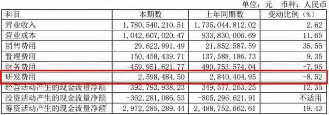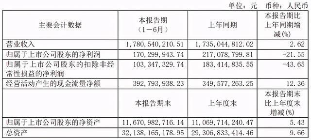 本次年中报告显示,公司上半年实现营业收入约17.81亿元,同比增长2.62%;归属于上市公司股东的净利润约1.70亿元,同比下降21.55%;扣非净利润为1.03亿元,同比下降43.65%。