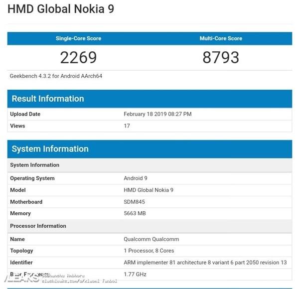 IT之家2月19日消息 诺基亚9 PureView手机的Geekbench跑分之前已经曝光,但是多核成绩明显达不到骁龙845的水平,现在一款型号HMD Global Nokia 9的最新跑分曝光了,单核2269,多核8793。