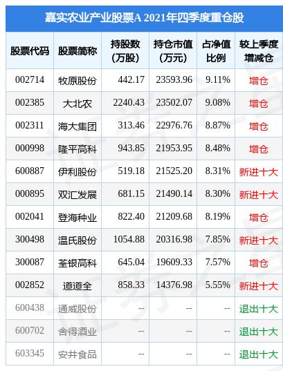 嘉实农业产业股票A的前十大重仓股如下: