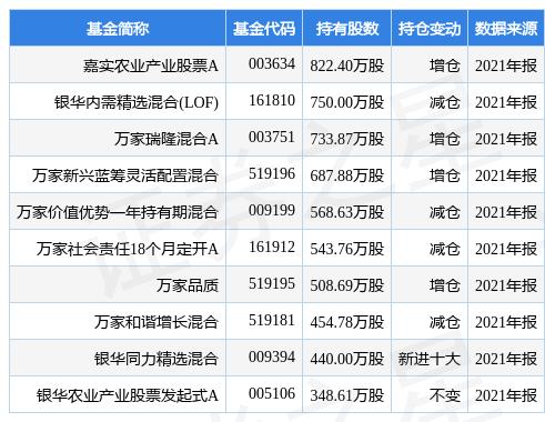 根据2021年报基金重仓股数据,重仓该股的基金共153家,其中持有数量最多的基金为嘉实农业产业股票A。嘉实农业产业股票A目前规模为25.89亿元,最新净值2.1033(3月22日),较上一日上涨0.82%,近一年下跌4.32%。该基金现任基金经理为吴越。吴越在任的公募基金包括:嘉实消费精选股票A,管理时间为2020年12月9日至今,期间收益率为-5.81%;嘉实新起航混合,管理时间为2021年10月22日至今,期间收益率为-5.28%;嘉实内需精选混合A,管理时间为2022年1月6日至今,期间收益率为-0.69%。