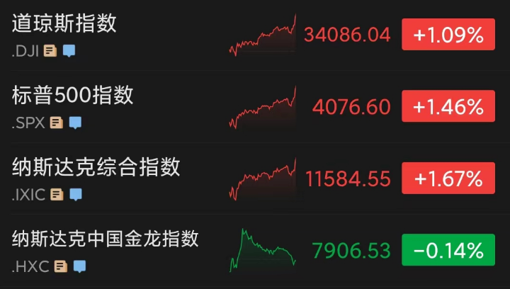 当地时间周二,美股三大指数高开高走,尾盘集体拉升。截至收盘,道指涨1.09%,报收34086.04点;纳指涨1.67%,收于11584.55点;标普500指数涨1.46%,报收4076.60点。