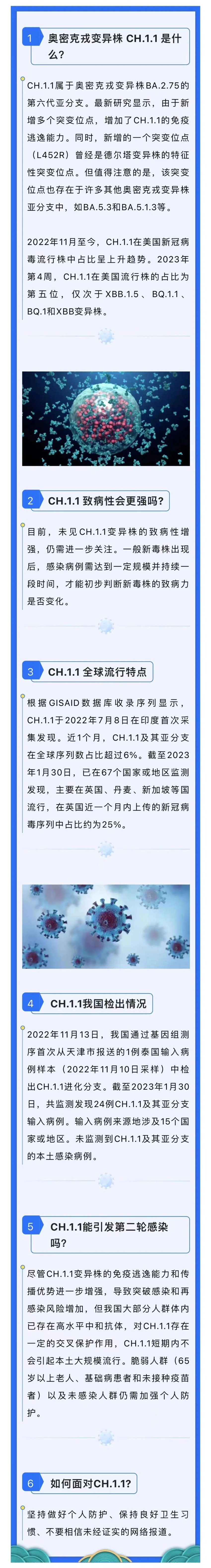 其他重要消息方面,1月31日晚11时45分,中国疾控中心微信公众号发文称,目前,未见CH.1.1变异株的致病性增强,仍需进一步关注。尽管CH.1.1变异株的免疫逃逸能力和传播优势进一步增强,导致突破感染和再感染风险增加,但我国大部分人群体内已存在高水平中和抗体,对CH.1.1存在一定的交叉保护作用,CH.1.1短期内不会引起本土大规模流行。