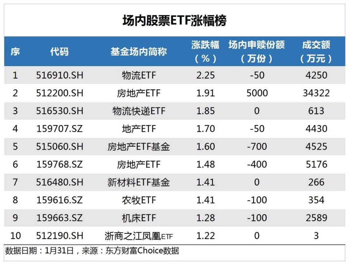 数据显示,昨日场内股票型ETF中,物流ETF、房地产ETF和物流快递ETF涨幅靠前,其中,物流ETF涨幅2.25%,排名第一。