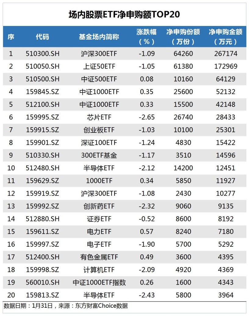 昨日(1月31日),两市今日成交额9002亿,较上个交易日缩量1619亿。东方财富Choice数据显示,昨日场内股票型ETF净申购18.91亿份,其中,沪市股票型ETF净申购15.56亿份,深市股票型ETF净申购5.35亿份。以最新净值计,昨日市场净申购金额68.6亿元。