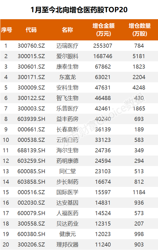 康泰生物、东富龙、安科生物、智飞生物、乐普医疗、益丰药房、长春高新、云南白药等个股北向增持金额在6.8亿元至3亿元之间。