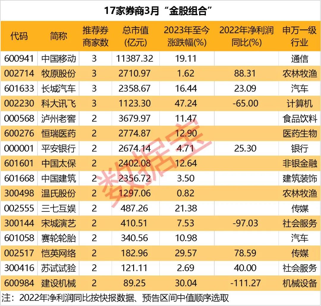 已有17家券商发布3月月度策略及金股组合,中国移动、牧原股份、长城汽车、科大讯飞均进入3家券商金股名单。
