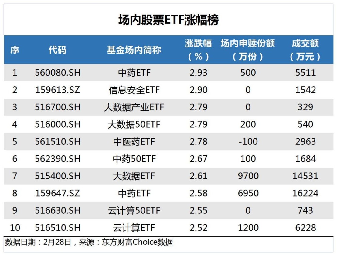数据显示,昨日场内股票型ETF中,中药ETF、信息安全ETF和大数据产业ETF涨幅靠前,其中,中药ETF涨幅2.93%,排名第一。