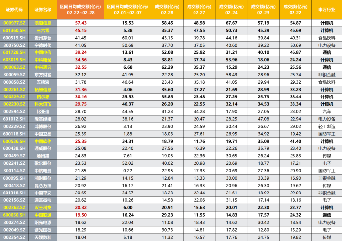 从成交额角度统计,近五个交易日(2月22日至28日)中,两市日均成交额居前的30股中,所属与数字经济相关的计算机和通信板块个股达11只,占比近36.7%,而这一数值在此前2月初(2月1日至7日)仅为5只,占比近16%。具体来看,浪潮信息、三六零、中国电信、中科曙光、中兴通讯、拓维信息、拓尔思在近五日行情中最受资金青睐,其日均成交额均超30亿元。
