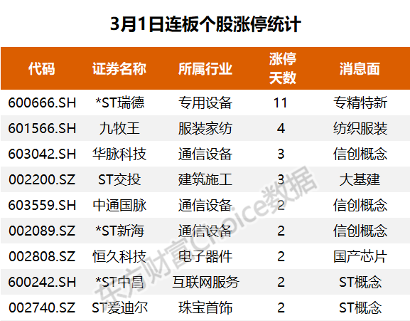 个股方面,纺织股九牧王4板,信创算力方向华脉科技3板、中通国脉2板,数字经济方向恒久科技2板,人工智能方向网达软件4天2板。