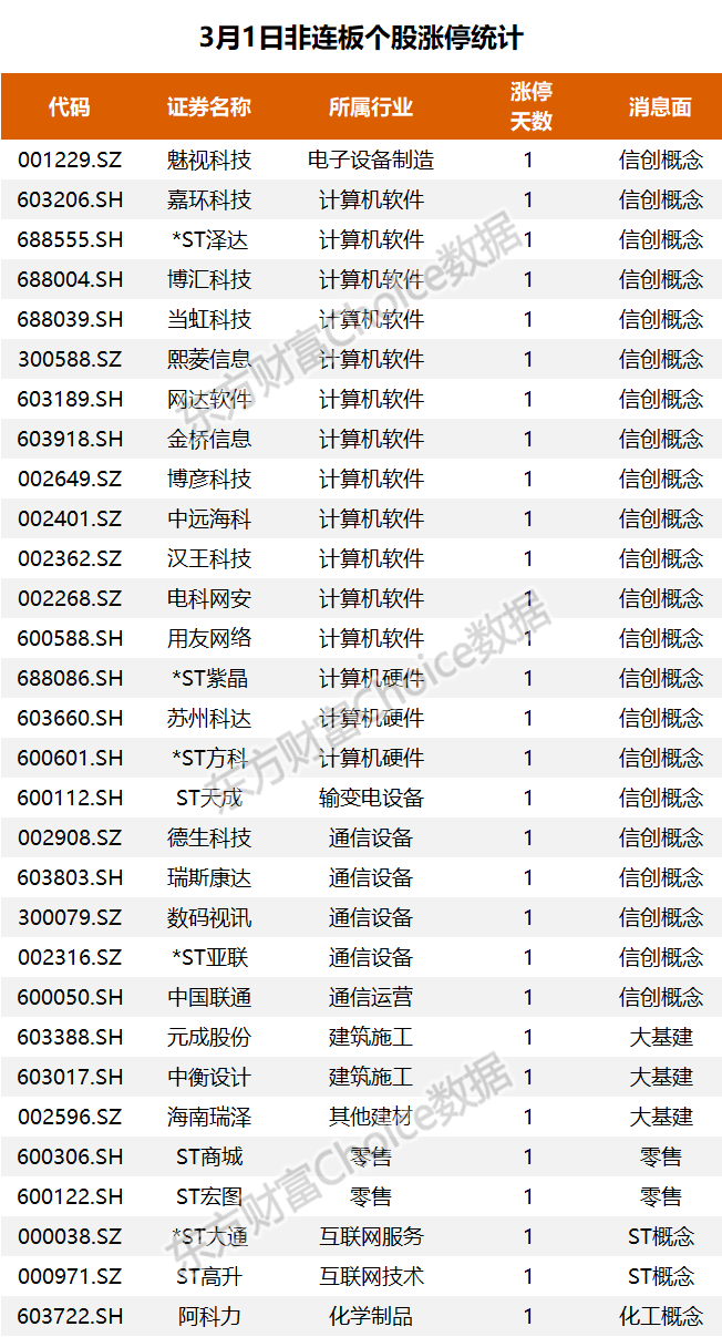 今日非连板个股涨停统计