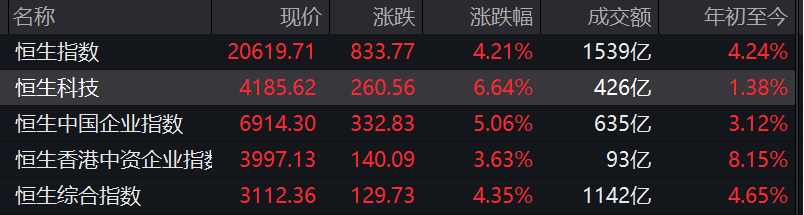 港股方面,两大股指暴力拉升,恒生指数涨超4%站稳2万点,恒生科技指数大涨近7%。截至收盘,恒生指数涨4.21%报20619.71点,恒生科技指数涨6.64%报4185.62点。个股方面,蔚来涨11%,小鹏汽车涨9.61%,理想汽车涨8.62%,网易涨8.42%,百度集团、腾讯控股、哔哩哔哩等涨超7%。