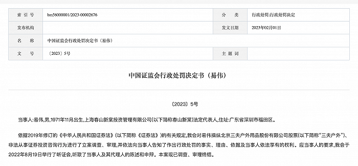 中国证监会公布了对易伟的行政处罚决定书。因操纵北京三夫户外用品股份有限公司股票(以下简称“三夫户外”)、从事证券投资咨询两项非法行为,证监会决定对其没收、处罚款项共计9988万元。