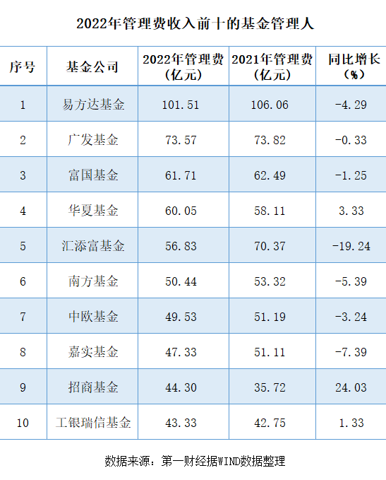 其中,易方达基金的管理费收入继续稳坐基金公司榜首,达到101.51亿元,较2021年的106.06亿元下滑了4.29%,这也是目前唯一一家管理费收入超百亿的基金公司。