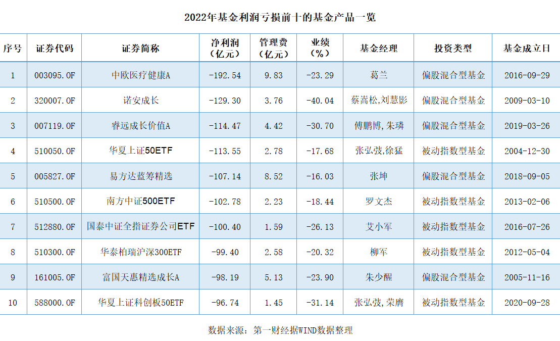 亏损超过百亿元的产品还有张坤管理的易方达蓝筹精选(-107.14亿元)、罗文杰管理的南方中证500ETF(-102.78亿元)、艾小军管理的国泰中证全指证券公司ETF(-100.4亿元)。