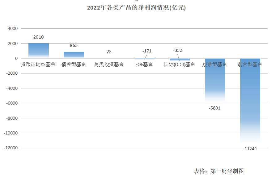 具体而言,货币市场型基金保持“稳定输出”,2022年合计盈利2010亿元;债券型基金以863亿元盈利次之。亏损最多的是混合型基金,年内累计亏损1.12万亿元;而股票型基金、国际(QDII)基金、FOF基金全年亏损额分别为5801亿元、352亿元、171亿元。