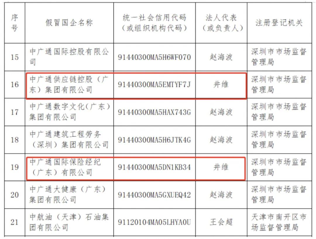 记者查询发现,井维此前已被国资委在“中央企业公告的假冒国企名单汇总(第二批)”中点名。国资委“中央企业公告的假冒国企名单汇总(第二批)”显示,有6家以“中广通”命名的公司为假冒央企。其中,“中广通供应链控股(广东)集团有限公司”和“中广通国际保险经纪(广东)有限公司”的法人代表正是井维。