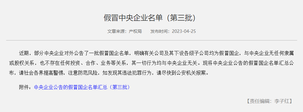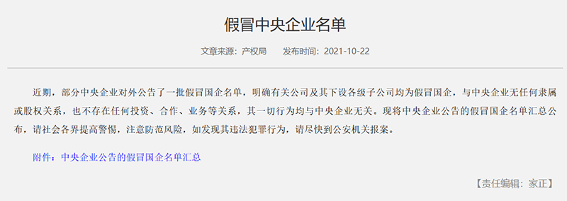 2021年10月,26家中央企业通过官网、微信公众号等多种渠道对外公告了353户假冒国企名单。通告社会各界,上述公司及其下设各级子公司均为假冒国企,与中央企业无任何隶属或股权关系,也不存在任何投资、合作、业务等关系,其一切行为均与中央企业无关。提醒社会各界提高警惕,注意防范风险。