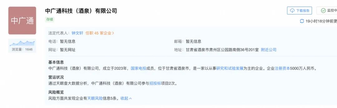 天眼查显示,中广通酒泉成立于2023年6月12日,位于甘肃省酒泉市,是一家以从事研究和试验发展为主的企业。企业注册资本5000万元。