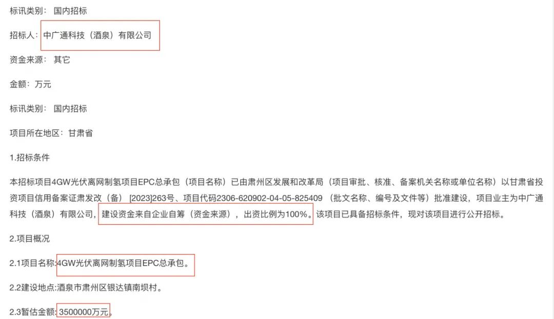 据中国招标投标公共服务平台,6月21日,中广通科技(酒泉)有限公司(以下简称“中广通酒泉”)发布了4GW光伏离网制氢项目EPC总承包招标公告。