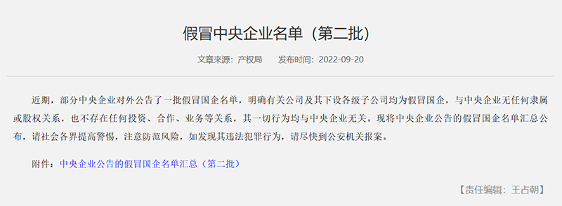 2022年9月,国务院国资委网站发布了第二批假冒中央企业名单。涉及企业528家。