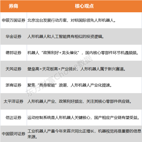 就此,寻找当前市场风口,申银万国证券表示,北京出台发展行动方案,对标国际领先人形机器人;德邦证券指出,机器人“政策利好+龙头催化”,国内核心零部件环节机遇频频;浙商证券认为,聚焦“具身智能”浪潮,人形机器人产业化提速。