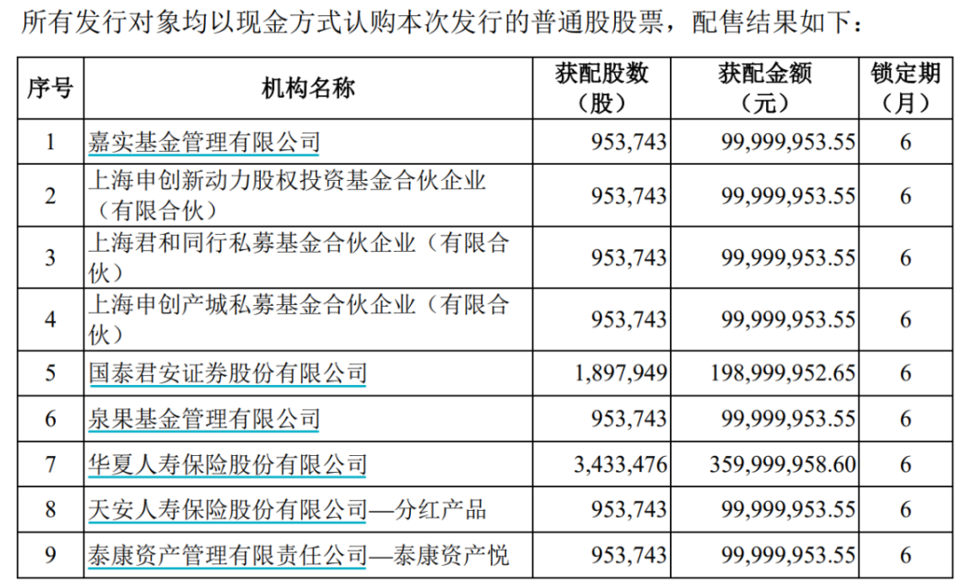 其中,获配数量较多的是诺德基金、华夏人寿保险,分别获配441.58万股、343.35万股,获配金额分别为4.63亿元、3.60亿元。