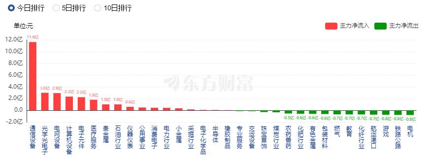 行业资金方面,截至收盘,通信设备、光学光电子、电网设备等净流入排名靠前,其中通信设备净流入11.63亿元。