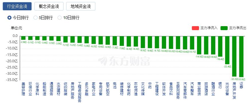 净流出方面,证券、房地产开发、光伏设备等净流出排名靠前,其中证券净流出32.60亿元。