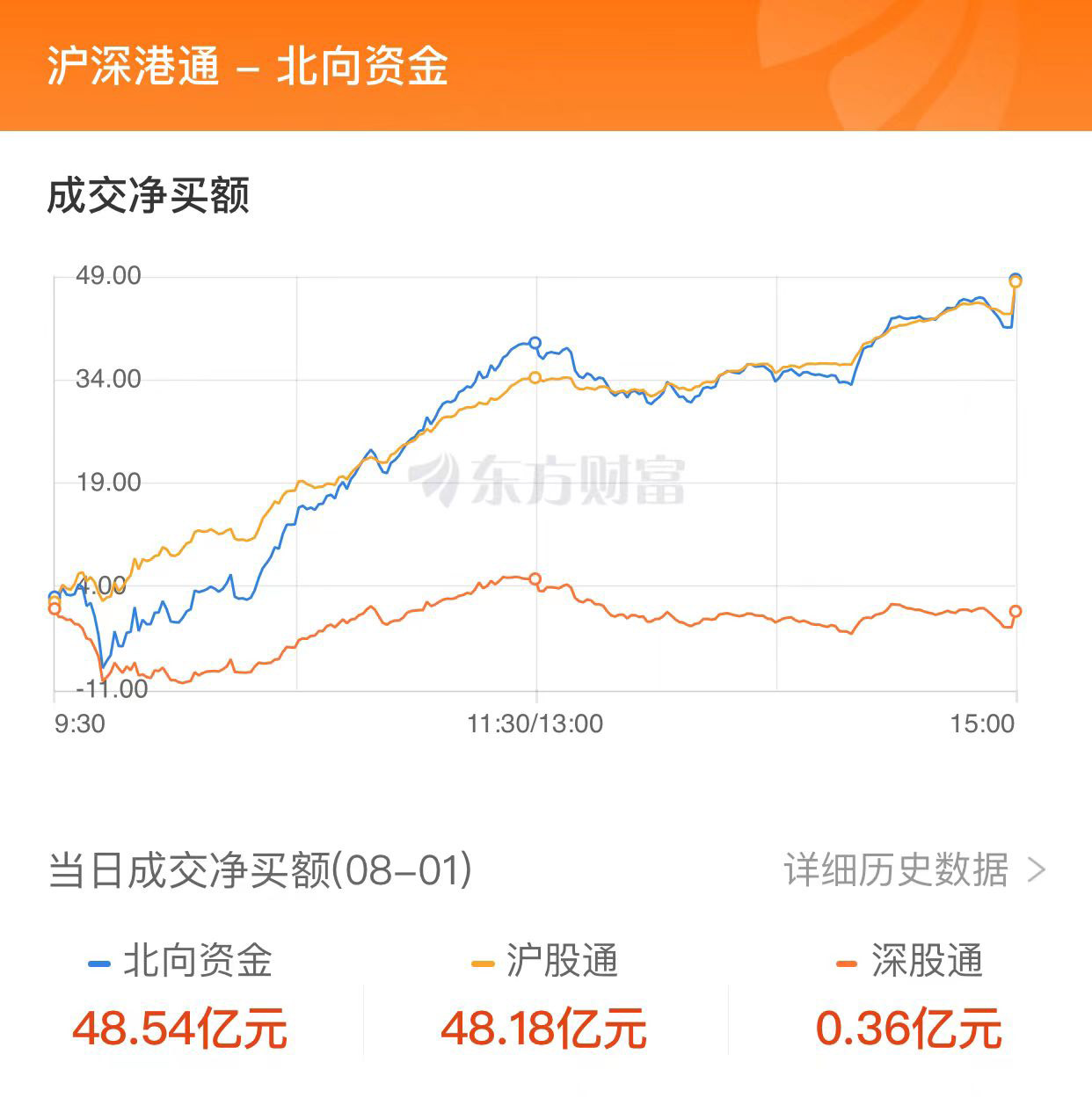 北向资金今日净流入,截至收盘,沪股通净流入48.18亿元,深股通净流入0.36亿元,合计净流入48.54亿元。