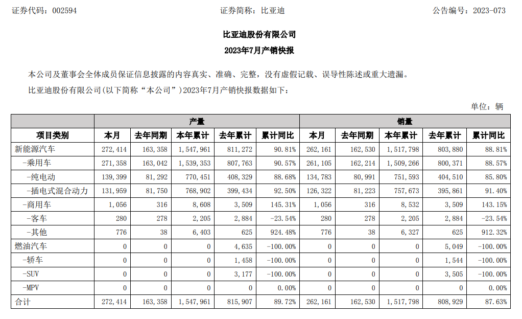 比亚迪公告,7月新能源汽车销量262161辆,上年同期销量162530辆;7月海外销售新能源乘用车合计18169辆。