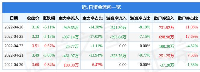 资金流向数据方面,4月26日主力资金净流出949.65万元,游资资金净流出541.3万元,散户资金净流入731.92万元。