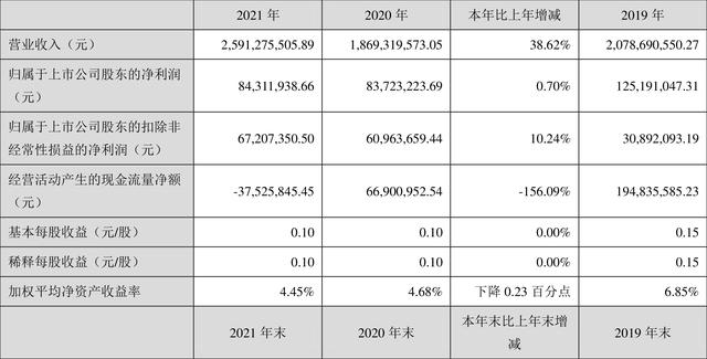 中证财讯 神剑股份(002361)4月28日披露2021年年度报告。2021年,公司实现营业总收入25.91亿元,同比增长38.62%;归母净利润8431.19万元,同比增长0.70%;扣非净利润6720.74万元,同比增长10.24%;经营活动产生的现金流量净额为-3752.58万元,上年同期为6690.10万元;报告期内,神剑股份基本每股收益为0.10元,加权平均净资产收益率为4.45%。公司2021年度分配预案为:拟向全体股东每10股派1元(含税)。