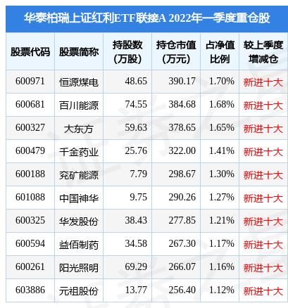 华泰柏瑞上证红利ETF联接A的前十大重仓股如下: